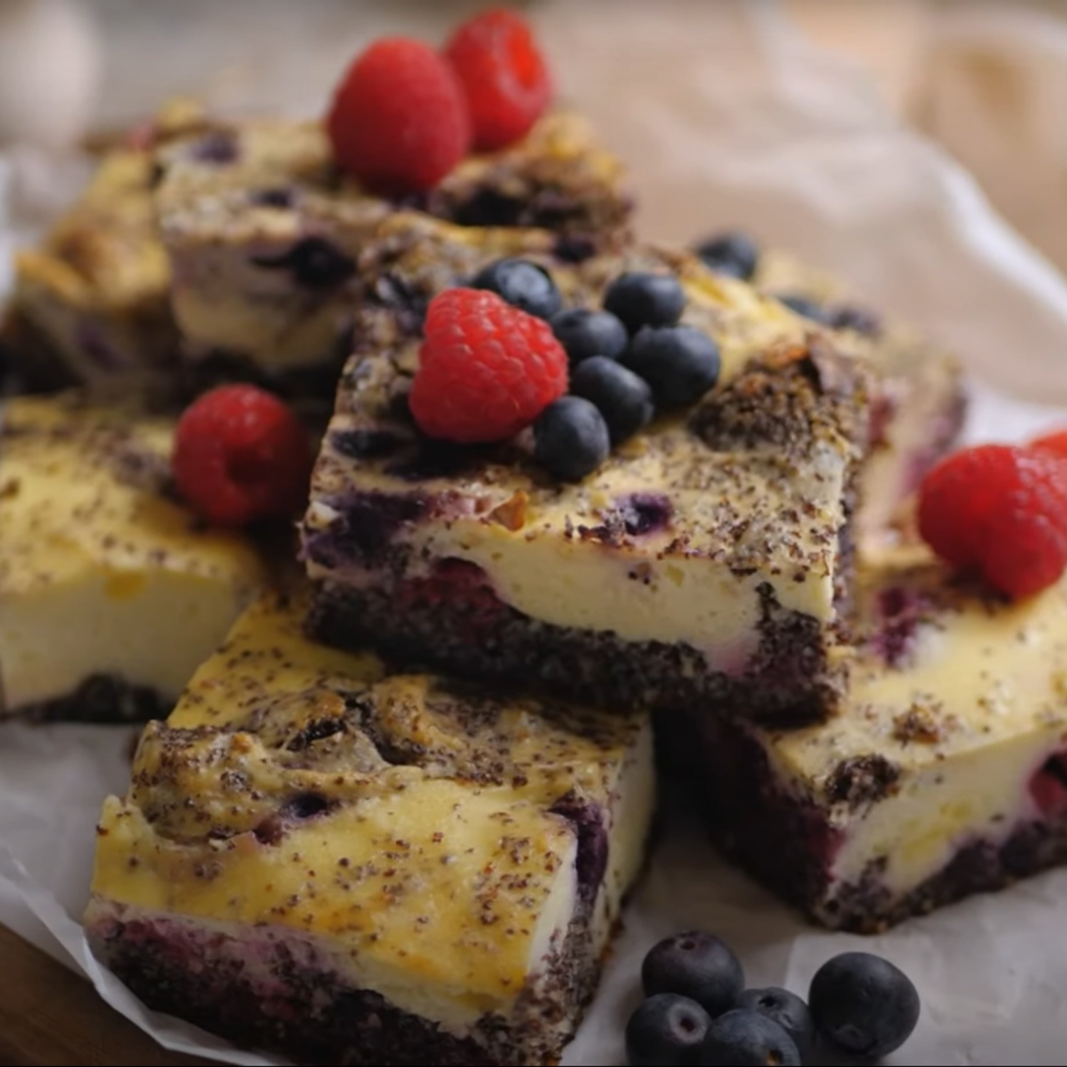 Mohn und restliche Zutaten für den Boden gut verrühren und in eine mit Backpapier ausgelegte Backform (21 x 28 cm) geben. Tiefkühl-Beeren darauf verteilen.