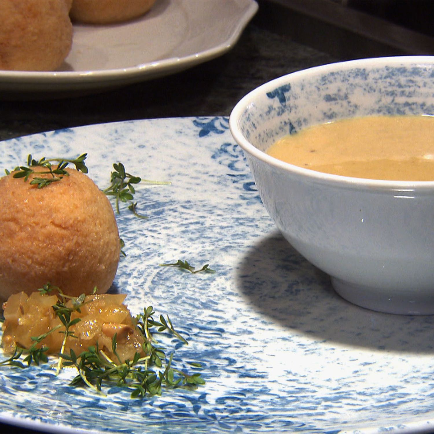 Die Suppe pürieren und, wenn gewünscht, durch ein Sieb streichen. Abschließend mit flüssigem Obers verfeinern, nicht mehr aufkochen. Suppe und Knödel anrichten, mit frischer Kresse und eventuell mit einem süß-sauren Apfel-Birnen-Chutney servieren.