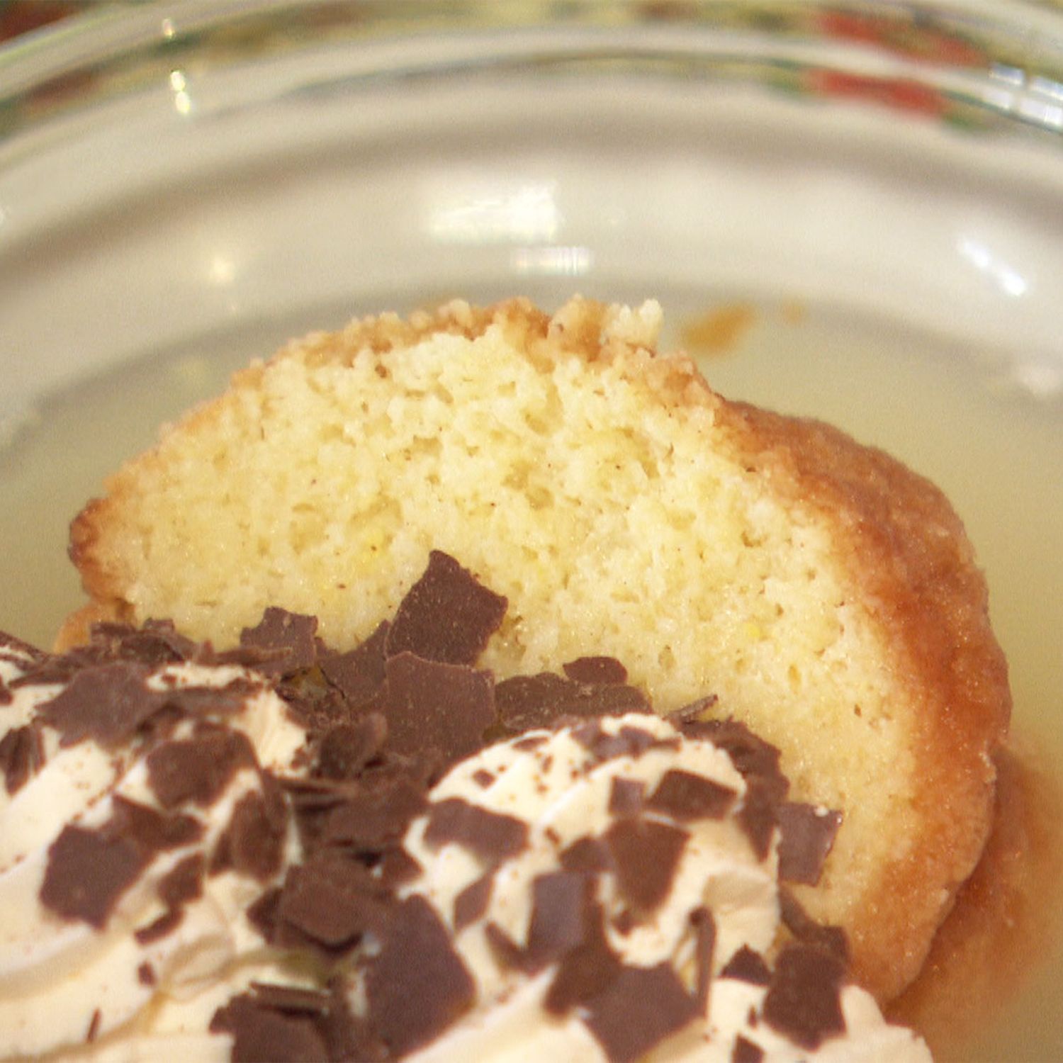 Die Mehlspeise kalt stellen und mit geschlagenem Obers und Schokoflocken verfeinern.