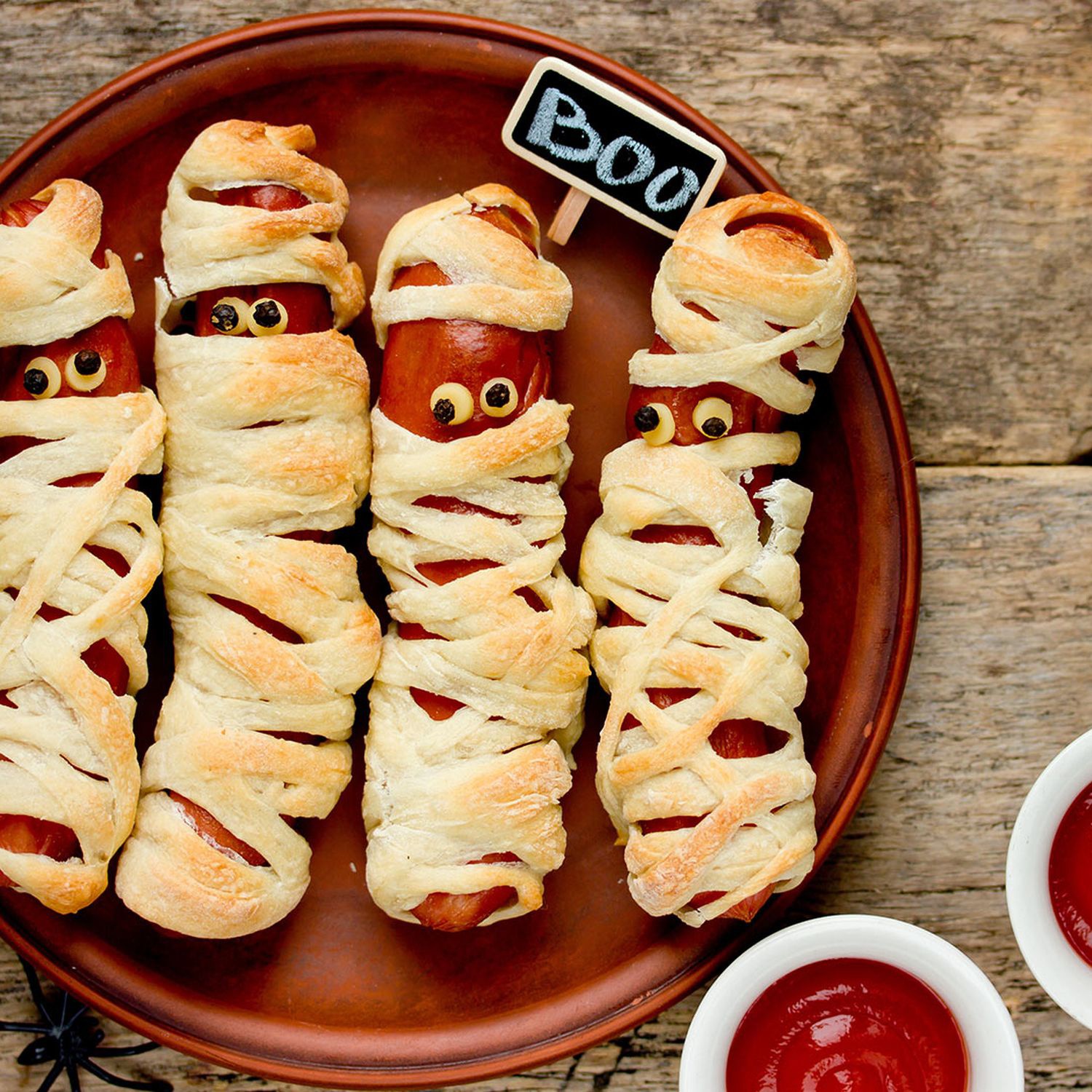Die fertig gestalteten Würstchen auf ein eingefettetes Backblech legen und ca. 10–15 Minuten backen. Die Mumien am besten mit Ketchup und Senf anrichten.