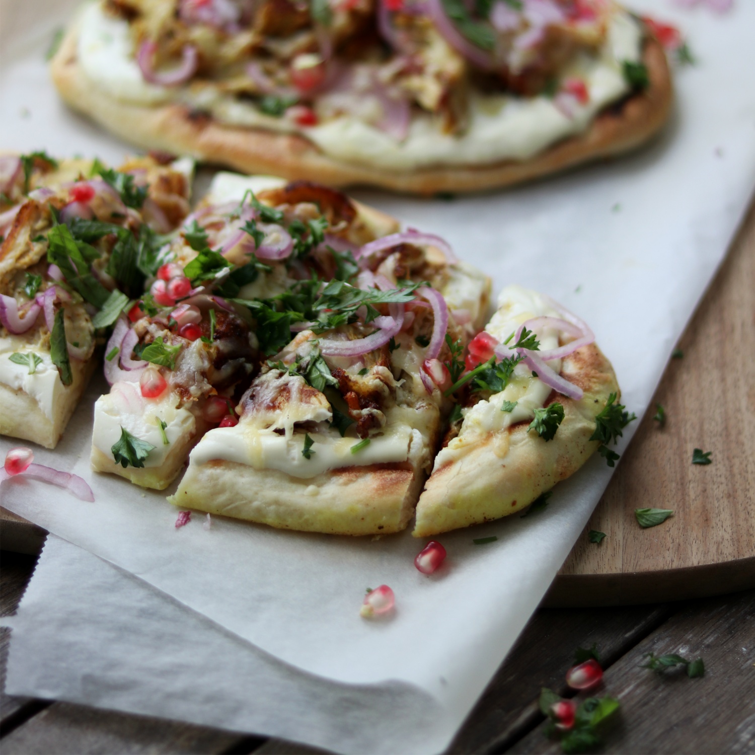 Backofen auf 200 °C Ober- / Unterhitze vorheizen. Die Naan Brote mit der Sauerrahm Mischung bestreichen, dann mit den Hühnerstücken, Zwiebel ringen belegen und mit etwas Käse bestreuen. Für ca. 5-10 Minuten auf einem mit Backpapier belegten Rost schön braun backen. Die fertigen Naan Pizzen aus dem Ofen nehmen und mit den gehackten Kräutern und Granatapfelkernen servieren. Am Ende alles noch einmal leicht salzen und mit etwas Limettensaft beträufeln.