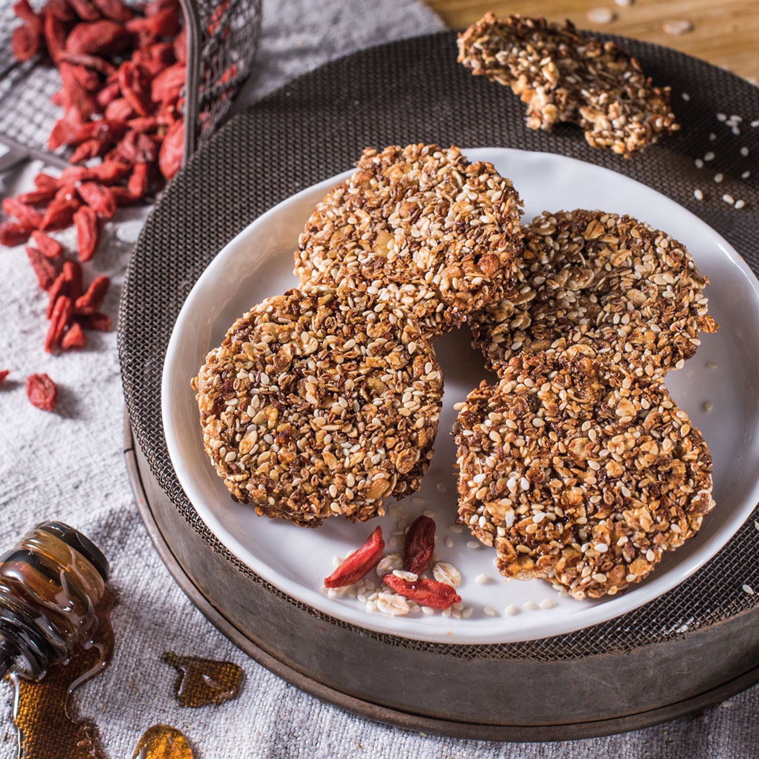 Walnüsse grob hacken. Sesam, Flohsamen, Mandeln, Haferflocken und gehackte Walnüsse vermischen. Anschließend Ei, Honig, Zucker und Vanillezucker verrühren, die restlichen Zutaten unterheben und die Masse zu einem Teig verarbeiten. Den Teig für ca. 10 Minuten rasten lassen.