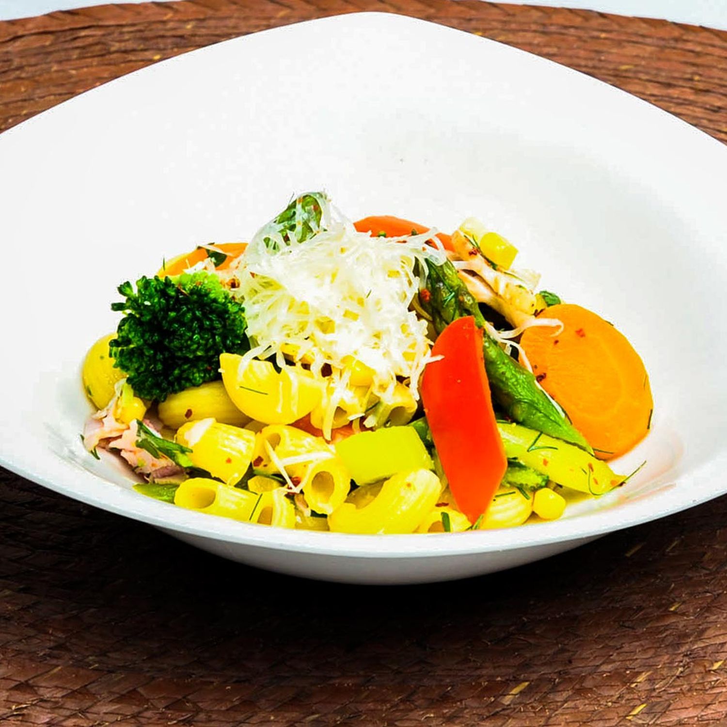 Die Nudeln in Salzwasser nach Packungsanleitung al dente kochen, auf ein Sieb abgießen, kurz ausdampfen lassen und mit dem Gemüse in einer Schüssel vermischen. Schinken, Champignons, Mais und Kräuter untermischen. Mit Essig und Olivenöl marinieren und mit Chili Salz und Zucker abschmecken. Zum Schluss etwas Bergkäse darüber reiben.