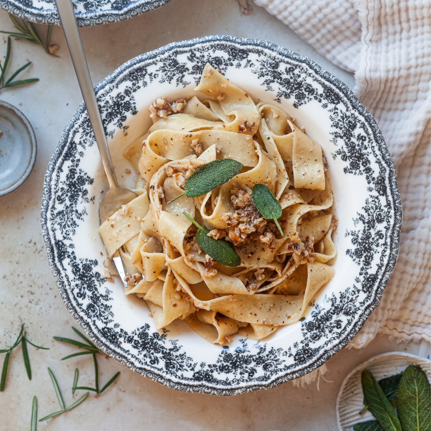 5. Die gekochten Nudeln in die Pfanne geben und gut mit der Butter-Walnuss-Soße vermengen. Falls das Gericht zu trocken wirkt, einen Schuss des aufgehobenen Nudelwassers hinzufügen, um eine seidige Soße zu erhalten.