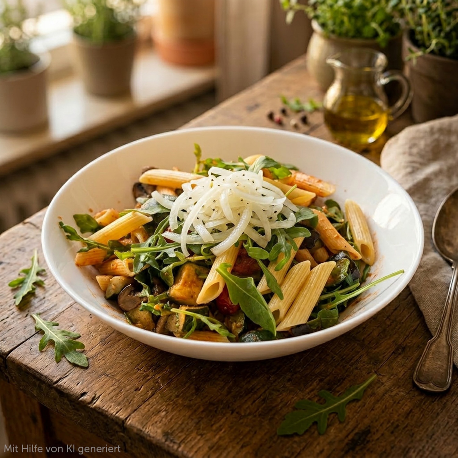Nudelsalat mit Grillgemüse und Rettenswert Tomate Basilikum Aufstrichbringt mediterranen Genuss auf den Teller.Abgerundet wird das Ganze mit frischem Rucola und dem Rettenswert Zwiebelsalat als leckeres Topping – perfekt als sommerliches Mitbringsel oder leichtes Abendessen.Detailbeschreibung siehe weiter unten