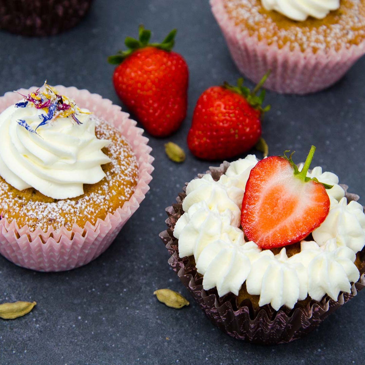 Das Schoko-Obers auf die ausgekühlten Muffins dressieren und nach Belieben mit getrockneten Blüten oder Pistazien bestreuen oder mit Beeren dekorieren.