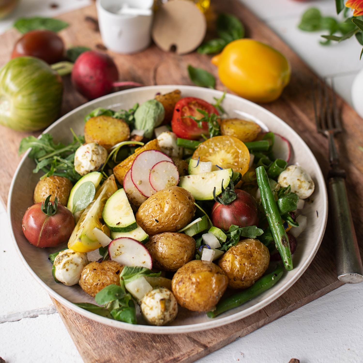 Die Tomaten und Radieschen je nach Größe halbieren oder vierteln. Den Kohlrabi halbieren, schälen und kleinwürfeln, die letzten fünf bis zehn Minuten im Ofen mit den Kartoffeln mitbacken. Die Zucchini kleinschneiden. Zucchini und Mozzarellabällchen in Pesto schwenken. Das Blech aus dem Ofen nehmen, nochmals durchrühren. Das frische Gemüse, die marinierten Mozzarellabällchen mit dem Salat und dem Rucola anrichten, dazwischen optional Pesto zum Dippen platzieren. Alles nochmals gut würzen und noch warm servieren.