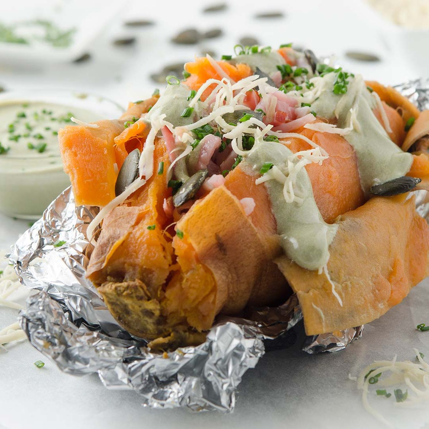 Ofen-Süßkartoffel mit Kernöl-Rahm, Beinschinken und Kren
