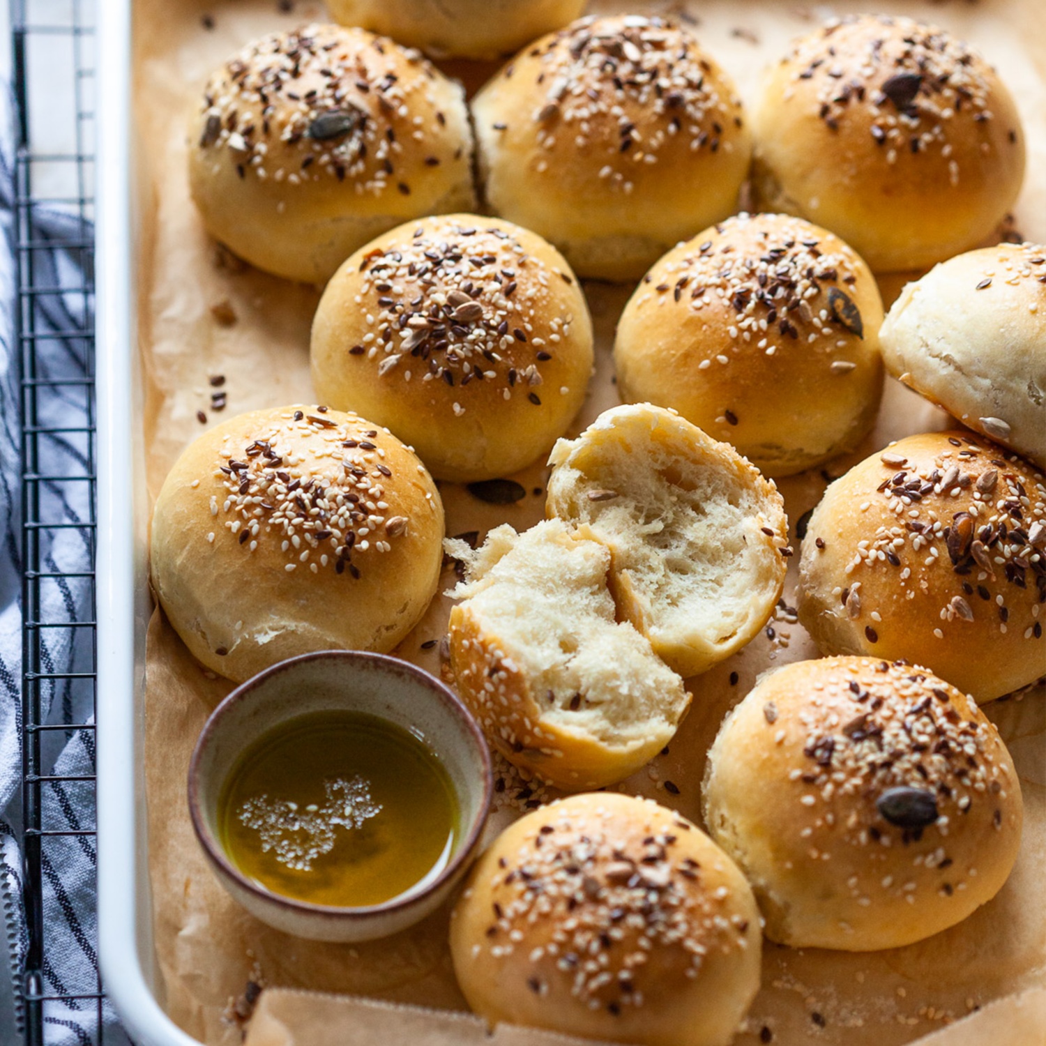 Den Teig in 12 gleichgroße Stücke teilen und zu runden Teiglingen formen. Auf ein Backblech geben und weitere 30 Minuten gehen lassen. Den Ofen auf 190°C Heißluft vorheizen.