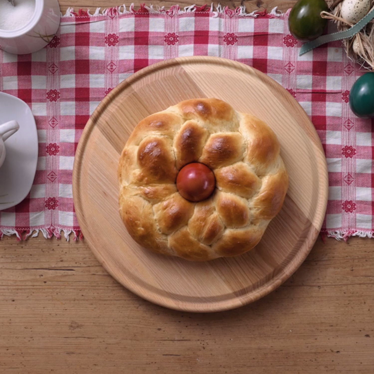 Das Gebäck aus dem Ofen geben und auskühlen lassen. Mit dem gefärbten Ei servieren.