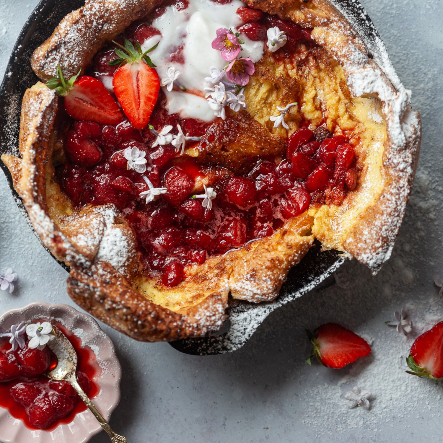 3. Die restliche Butter in die Pfanne geben und schmelzen lassen. Den Teig in die heiße Pfanne gießen und alles in den Ofen stellen. Etwa 15 Minuten, bis der Teig goldbraun ist, backen. Den Ofen während des Backens nicht öffnen, da der Pancake sonst zusammenfällt.