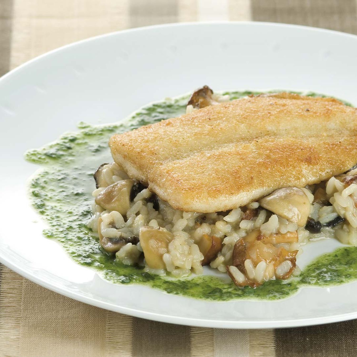 Die Filets salzen, mehlieren und in Öl-Buttermischung auf beiden Seiten 1–2 Minuten braten. Anschließend auf das Risotto setzen und mit Spinatbutter servieren.