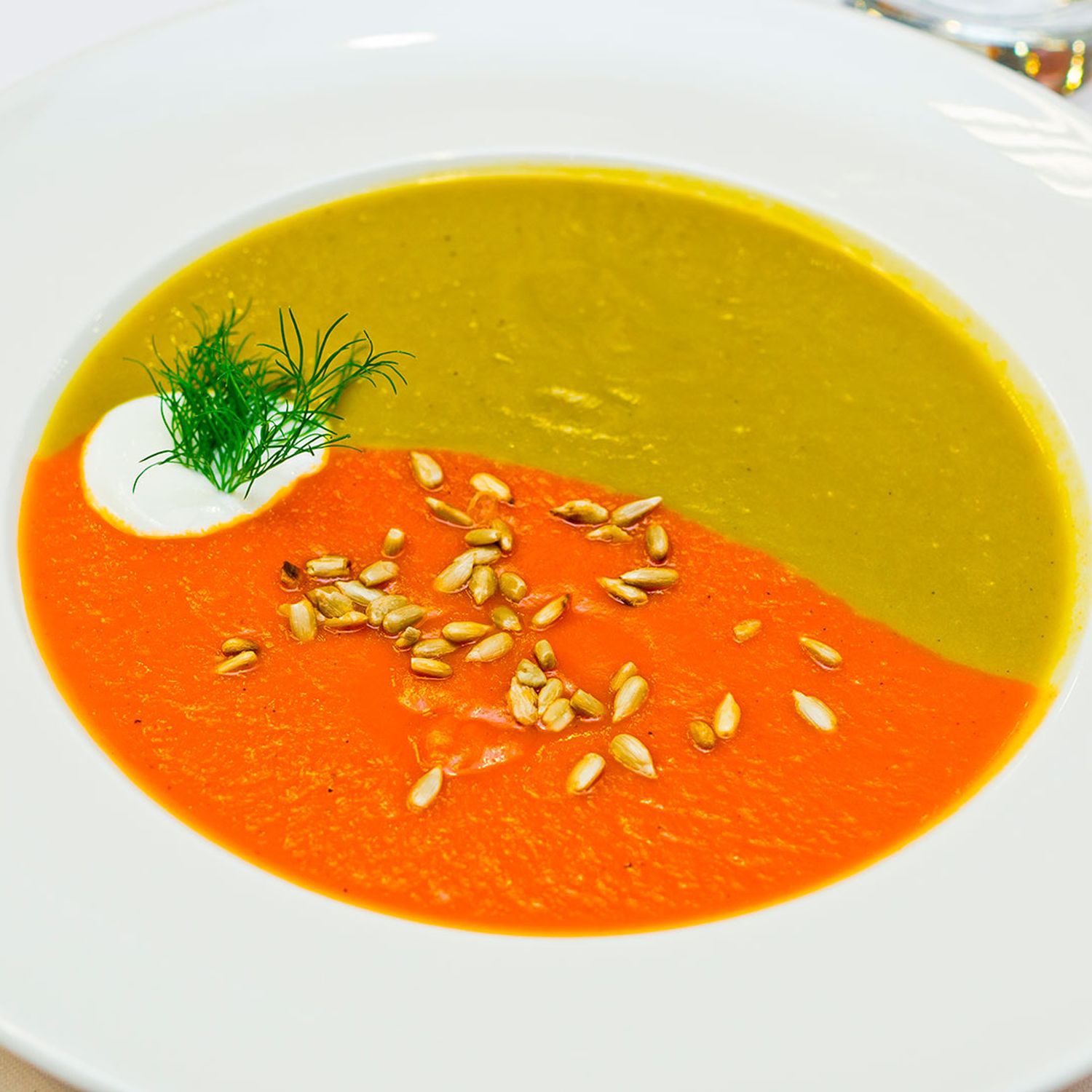 Beim Anrichten rote und grüne Suppe gleichzeitig in Suppenteller gießen – das ergibt ein tolles Farbenspiel.