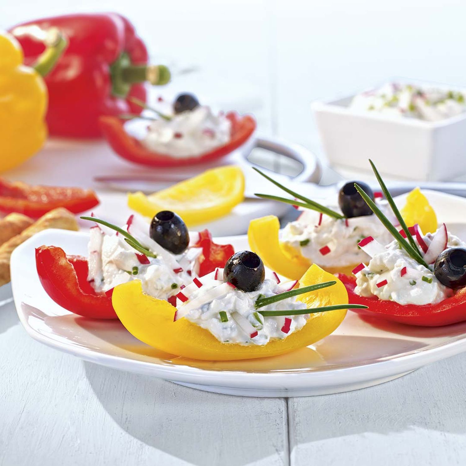 Paprika entkernen und in je 6 Spalten schneiden. Diese Spalten nun mit der Schafskäse-Topfencreme füllen. Radieschen in Stifte schneiden. Radieschen, Schnittlauch und Oliven dekorativ auf der Creme verteilen.