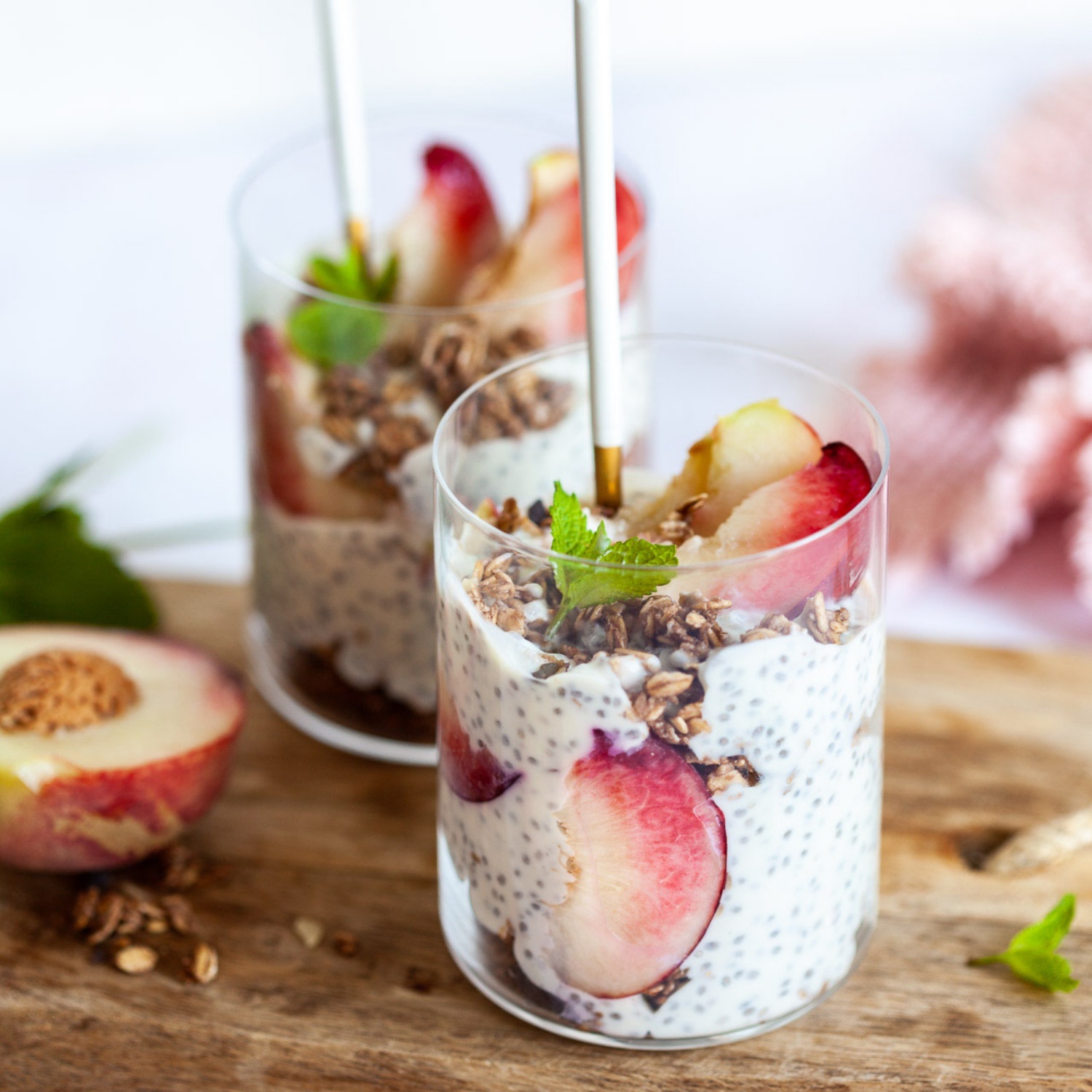 Heiße Sommertage erfordern kalte Mahlzeiten. Deshalb ist dieser einfach zubereitete Chia-Pudding mit Pfirsichen ein Sommer-Favorit!