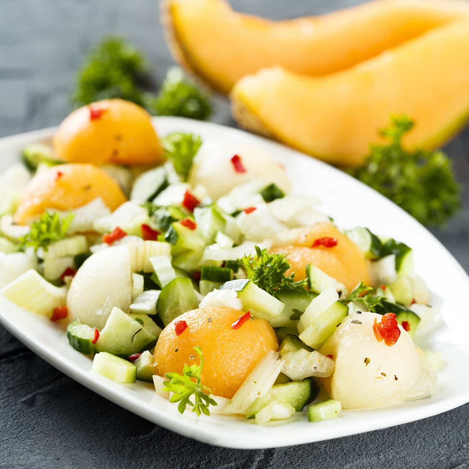 Melonenfruchtfleisch (Galia-, Honig- oder Cantaloupe-Melone – wahlweise auch andere Melonen) in ca. 3–4 cm große Stücke schneiden. Chili klein schneiden. Zwiebel schälen und in dünne Ringe schneiden.
