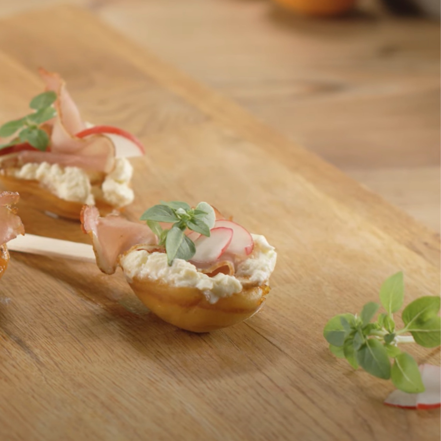 Für das Topping Creme Fraiche auf die Marillen auftragen. Mit Karreespeck, Radieschen und Basilikum verzieren. Zum Schluss noch einen Eisstiel in die Marille stecken und fertig!