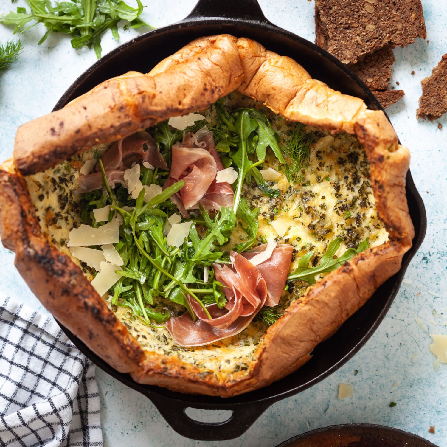 Wenn das Dutch Baby fertig gebacken ist, aus dem Ofen nehmen und mit Rucola und Prosciutto angerichtet servieren.