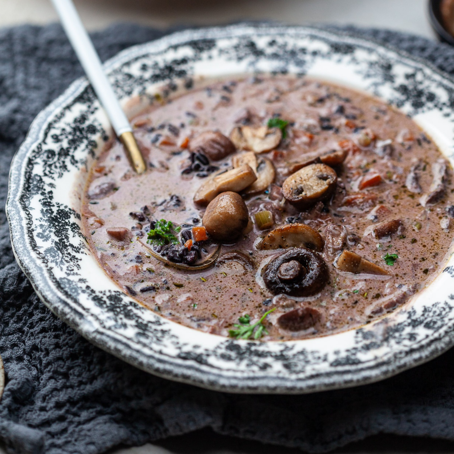 Eine reichhaltige und cremige Pilzsuppe, der wir gekochten Vollkorn-Reis hinzugefügt haben. Unbedingt ausprobieren!