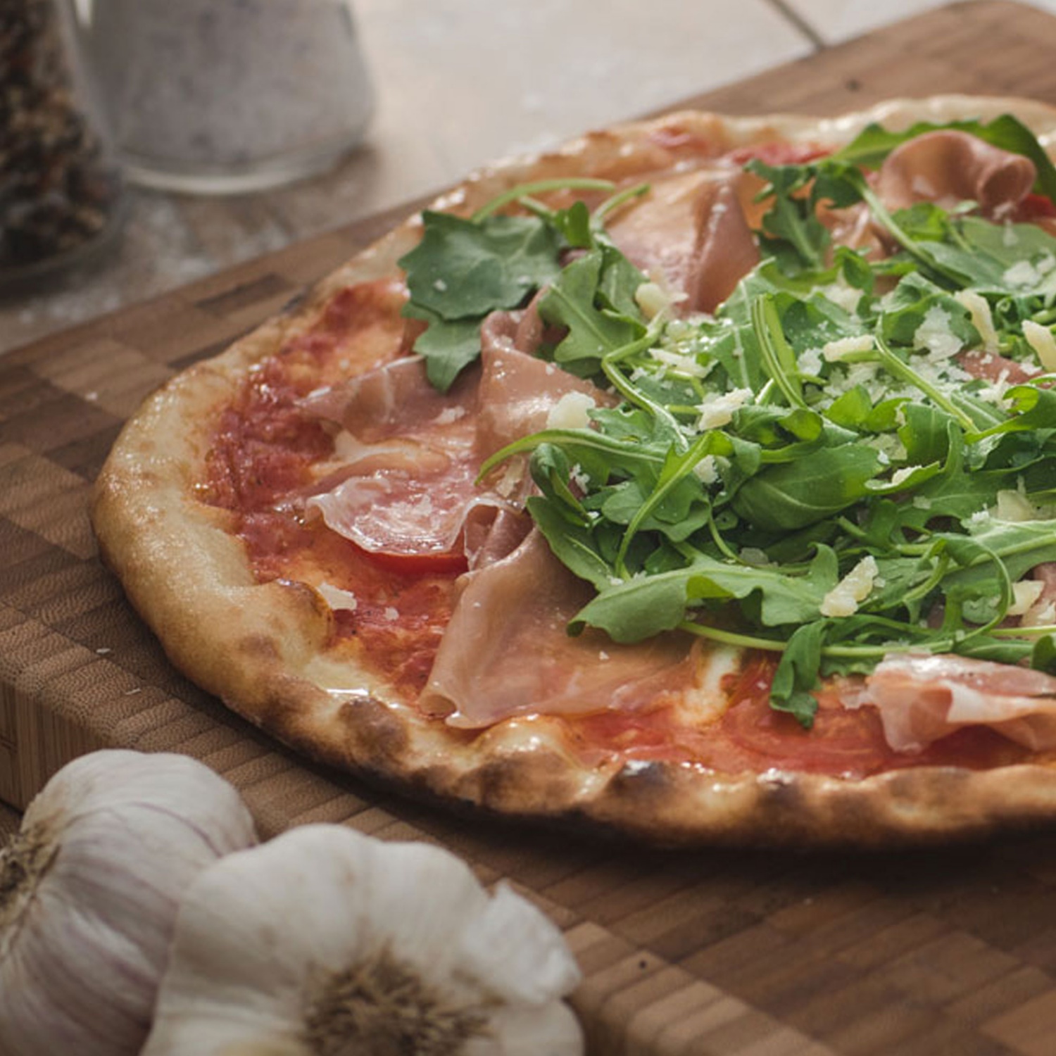 Die fertige Pizza mit Prosciutto und Rucola belegen sowie mit Parmesan garnieren.