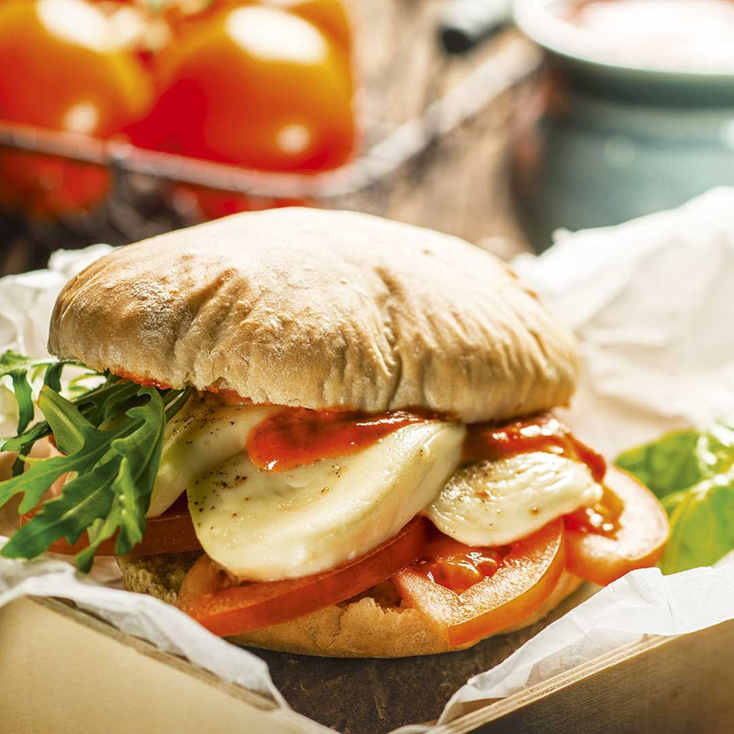 Pizzabrot halbieren und den Boden mit Tomaten und Mozzarella belegen, mit Salz und Pfeffer würzen. Den Boden dann im Ofen kurz gratinieren. Den Brotdeckel kurz im Ofen erwärmen und mit der Pesto Rosso-Mayonnaise bestreichen. Rucola auf dem Mozzarella verteilen und den Brotdeckel darauflegen.