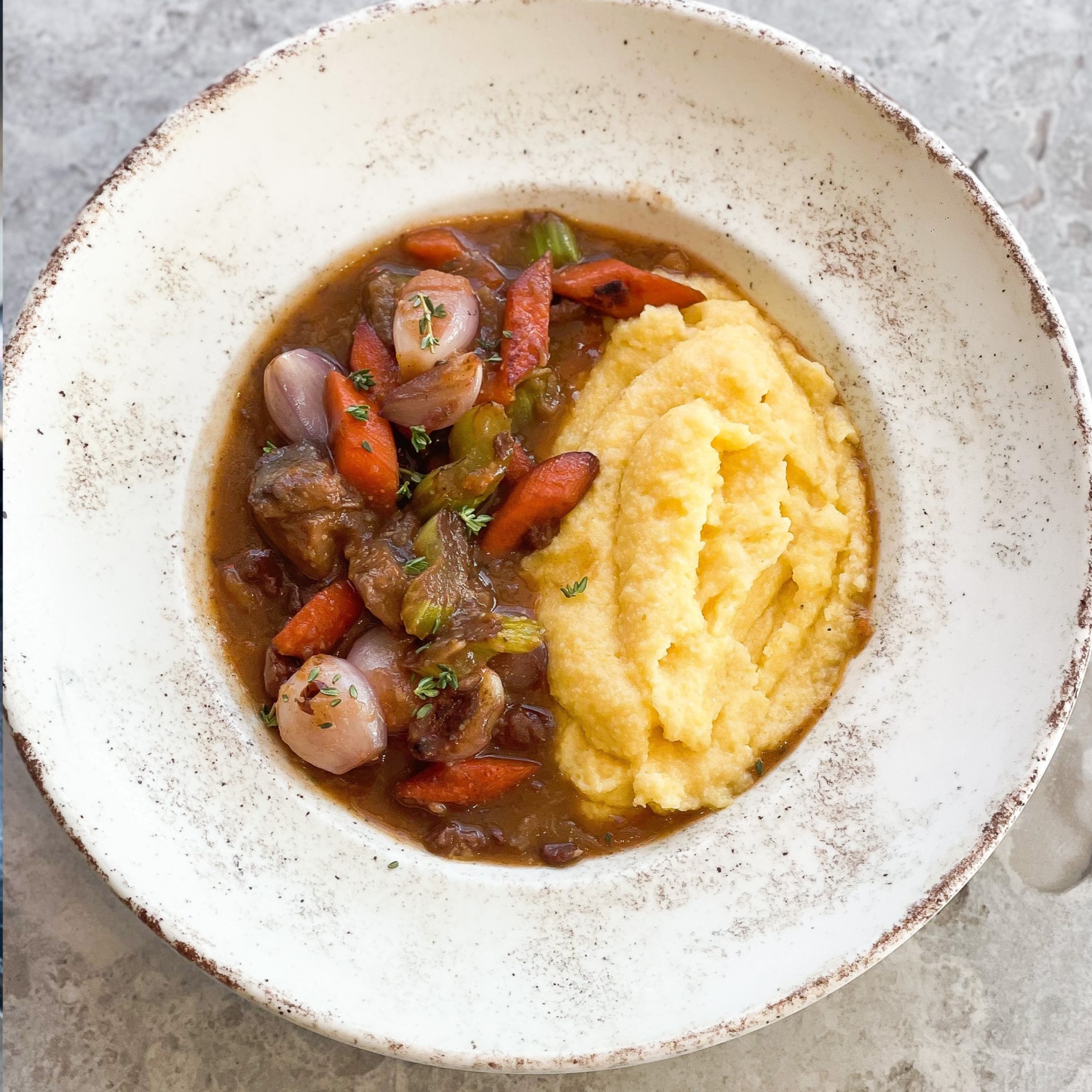 Pilze, Karotten, Süßkartoffel, Tomatenmark und Rotwein hinzugeben und einkochen lassen. Die Gemüsebrühe hinzufügen und die Sauce mit Salz, Lorbeerblättern und Thymian würzen. Die Silberzwiebeln hinzufügen und für ca. 20-30 Minuten kochen.