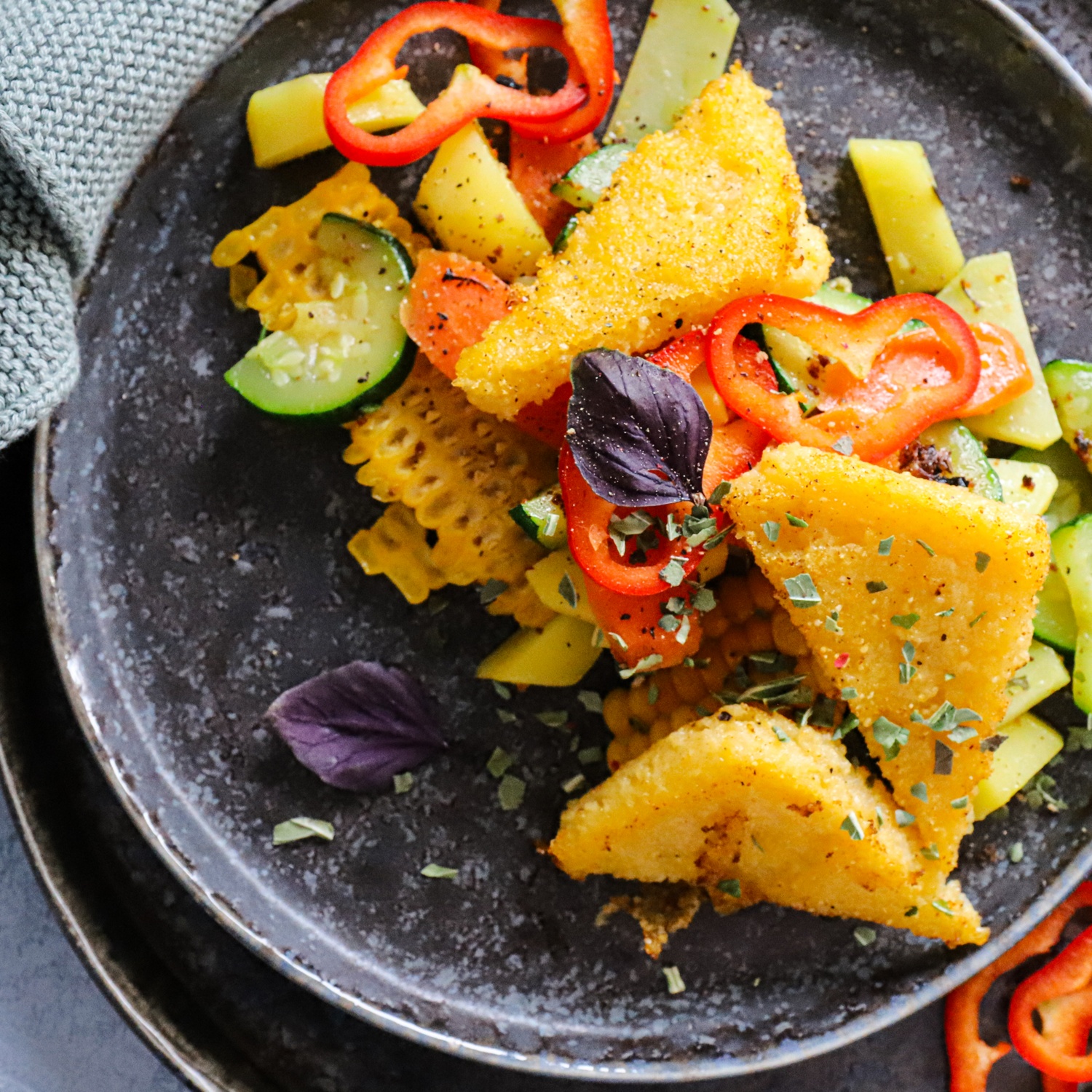 Polenta und Gemüsebrühe aufkochen lassen, Polenta dick einköcheln. Masse auf ein Backpapier in eine Form füllen und auskühlen lassen. Ausgekühlt in Dreiecke schneiden. In Butter beidseitig braten.