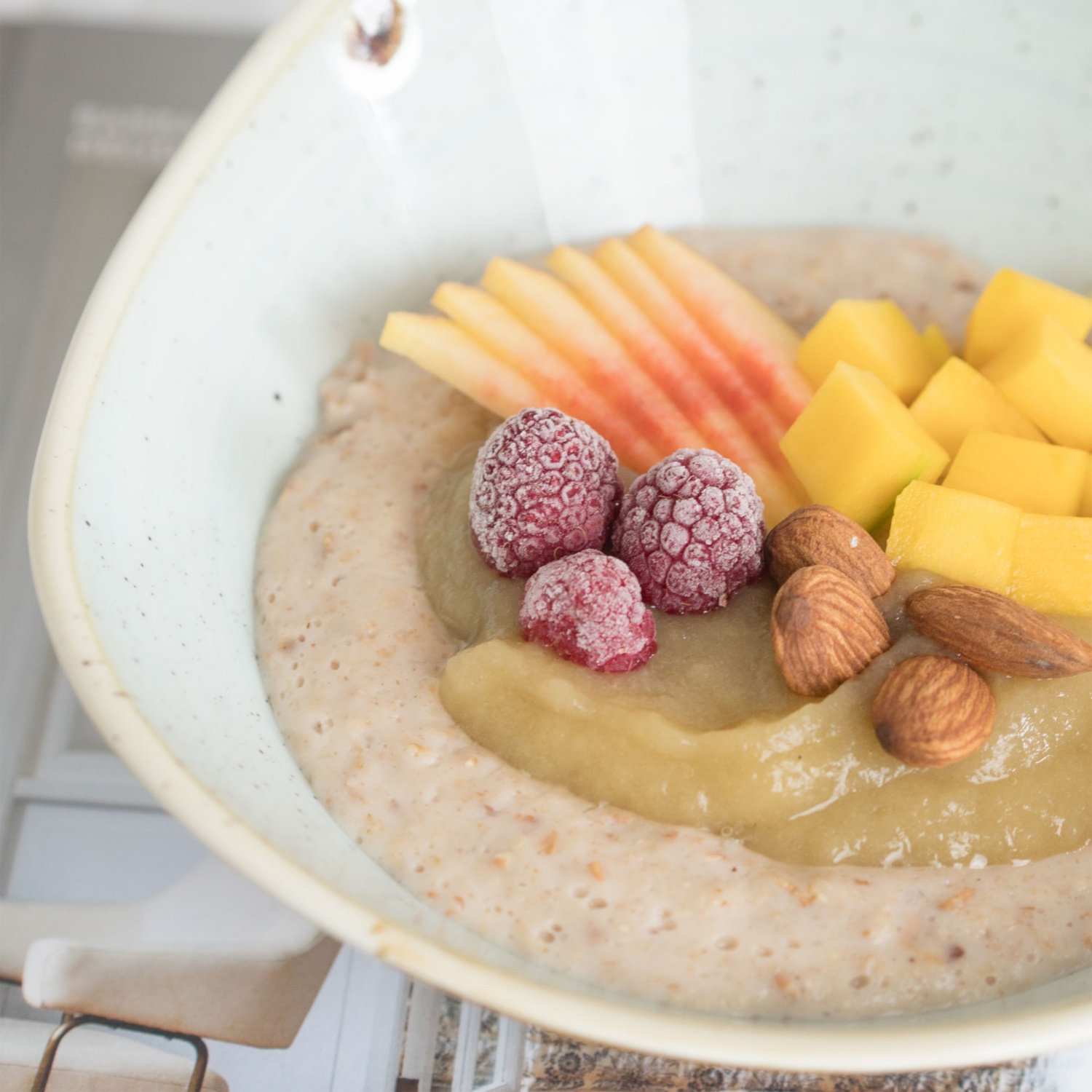 Zum Schluss wird der Porridge nach Lust und Laune mit frischem Obst und natürlich dem Rhabarber-Apfelmus garniert.