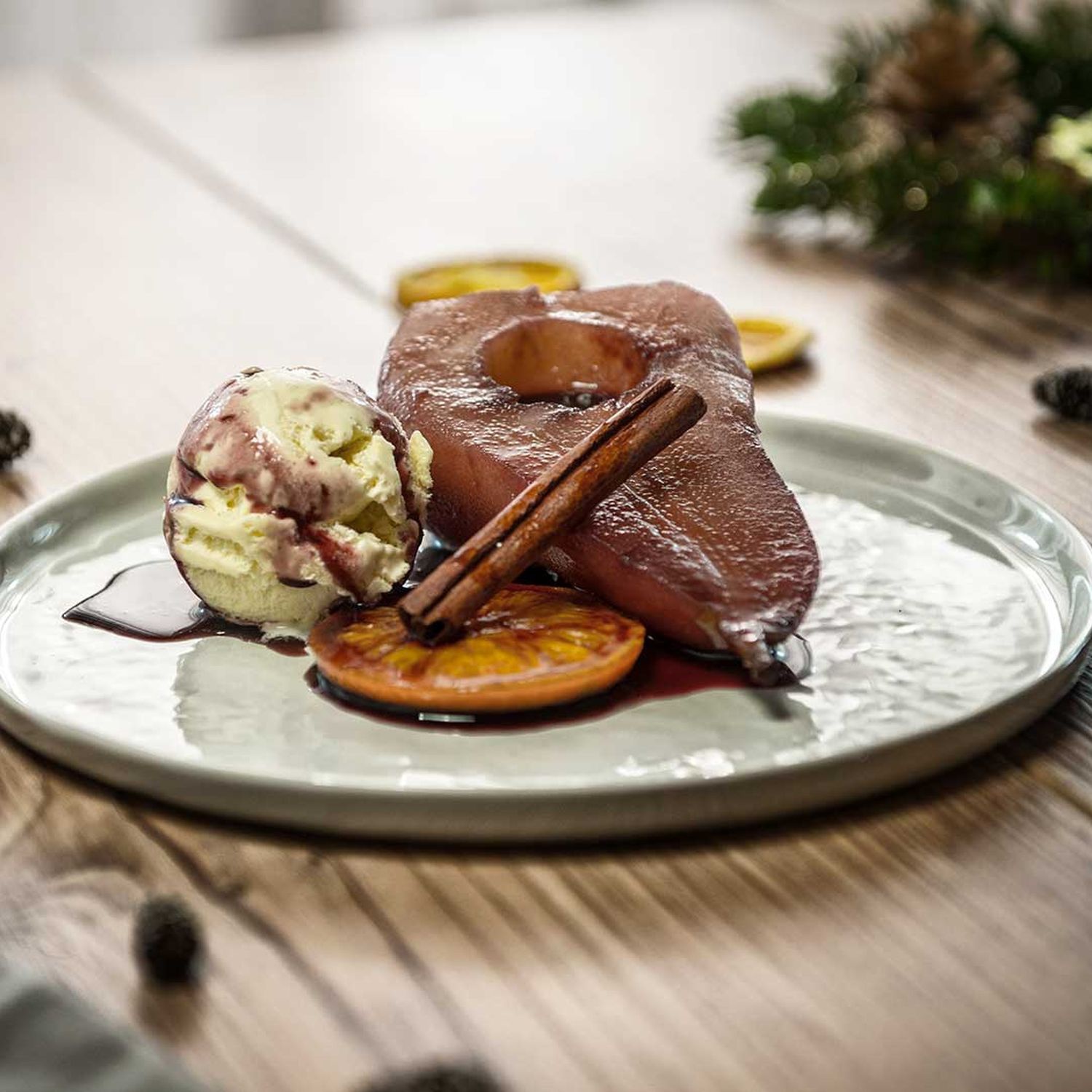 Portweinbirne mit Vanilleeis