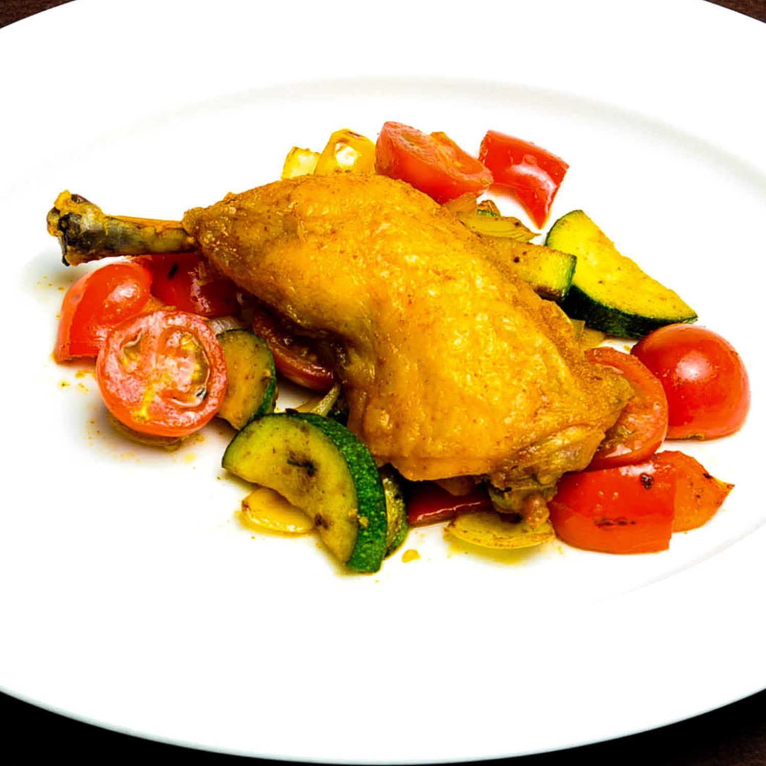 Poulardenkeulen aus dem Ofen mit mediterranem Gemüse