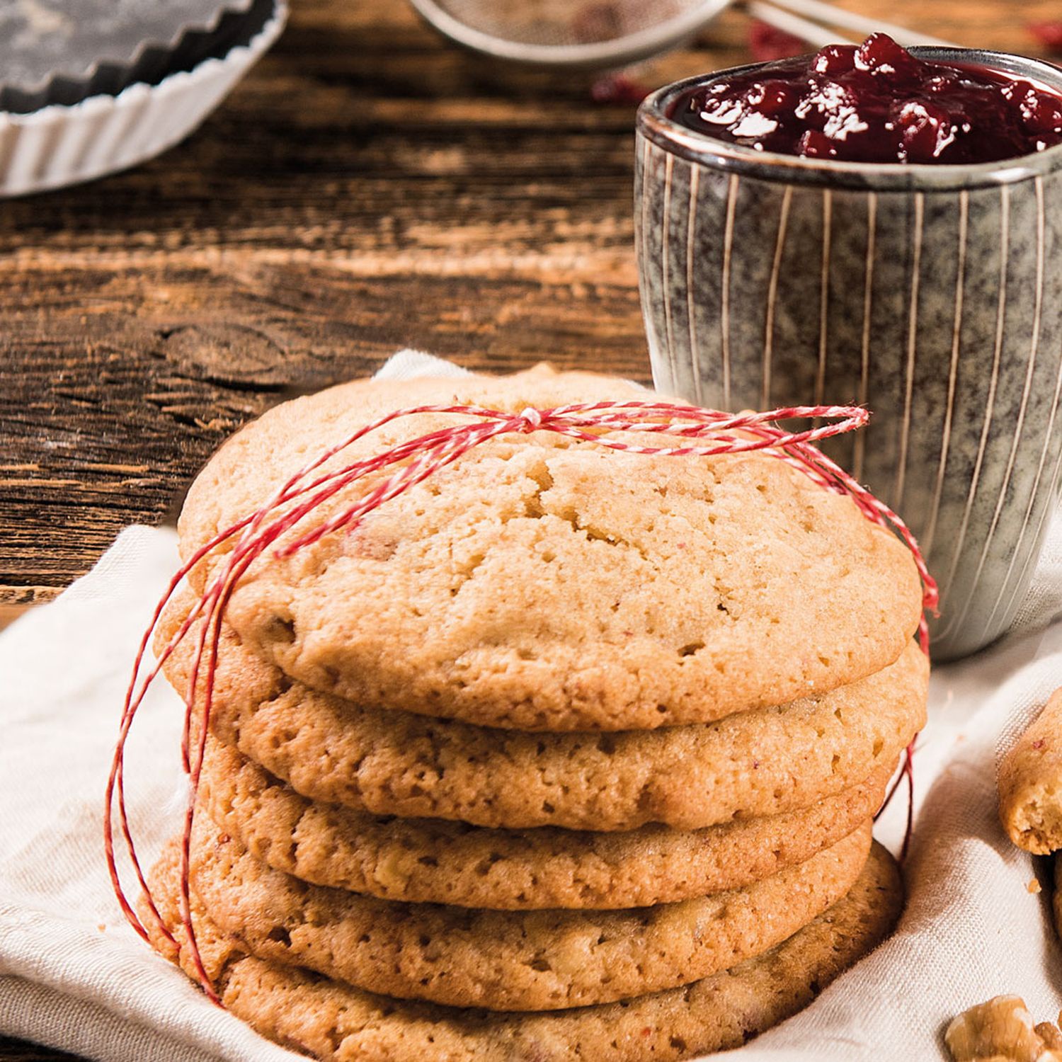 Preiselbeeren und Walnüsse unterheben. Mit einem Esslöffel Häufchen auf ein mit Backpapier belegtes Backblech platzieren und im Backrohr 10 bis 15 Minuten backen, bis diese goldbraun sind.