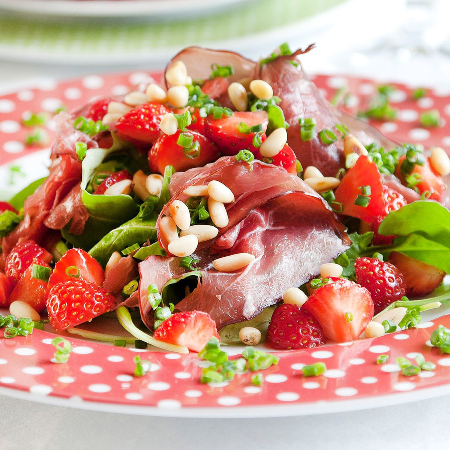 Diese Vorspeise ist nicht nur ausgefallen, sondern auch ein Schmaus für die Augen und den Magen. Genieße den köstlichen Prosciutto di Parma mit fruchtigem Erdbeersalat und gerösteten Pinienkernen.
