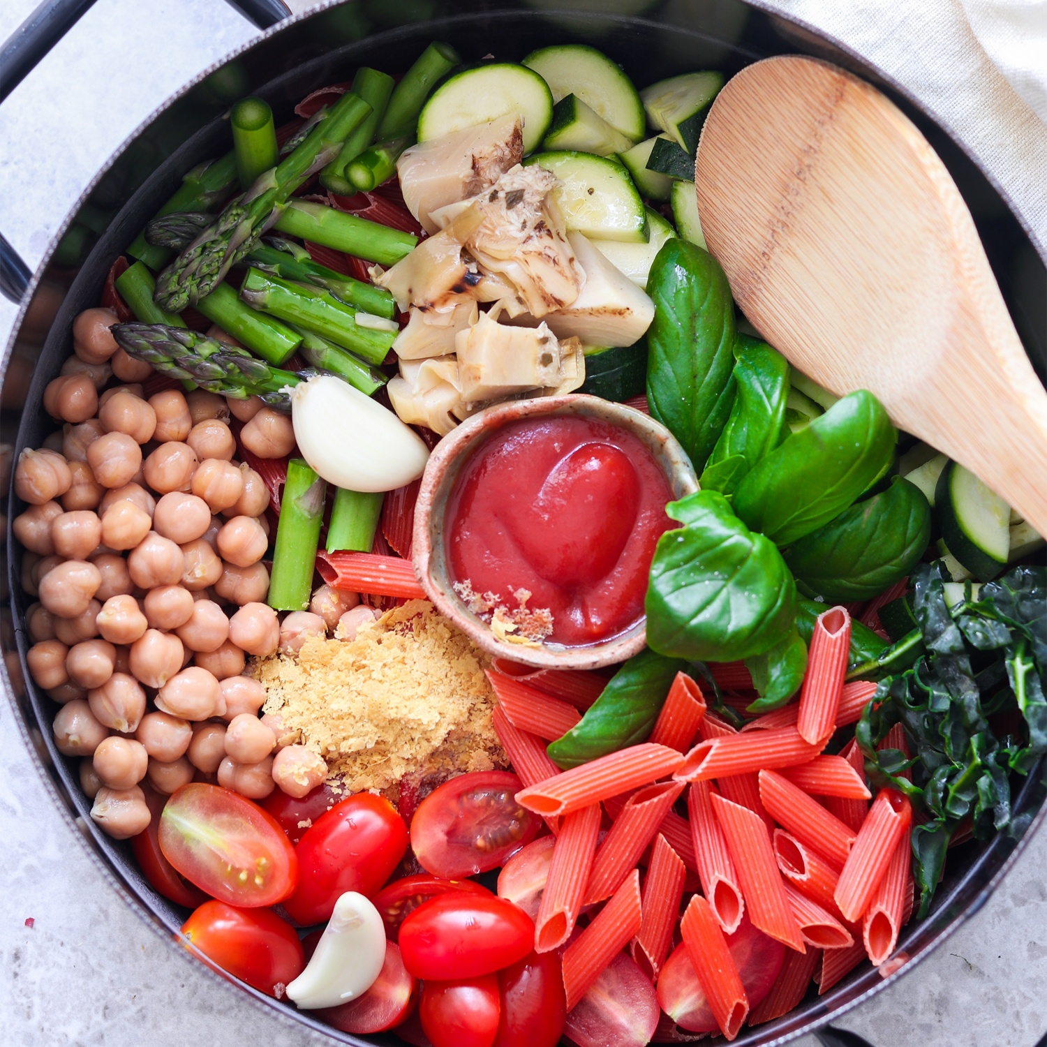 Diese Protein-Pasta kombiniert Linsenpasta mit nahrhaften Kichererbsen, Zucchini und Spargel. Gewürzt mit italienischen Kräutern, ergibt sich ein schnelles, gesundes Gericht!