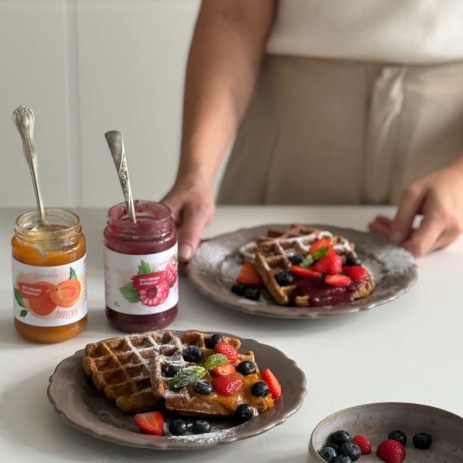 Genieße gesunde proteinreiche Waffeln aus Haferflocken und pflanzlicher Milch! Schnell zubereitet und lecker mit zuckerfreier Marmelade und frischen Beeren – der perfekte Start in den Tag!