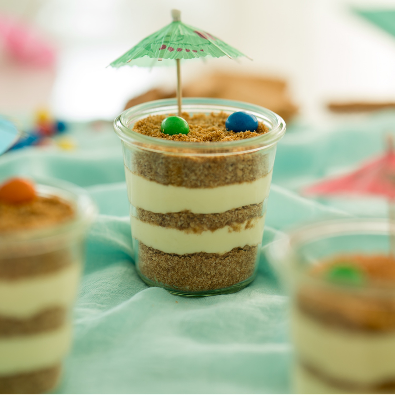 Sandpudding kann man nicht nur am Strand bauen, sondern auch daheim in der Küche. Und das Beste dieses Desserts im Glas: Unser Sandpudding schmeckt sogar. Für das richtige Sommerfeeling einfach noch dekorieren und schon fühlt man sich an den Strand versetzt. Der Sandpudding ist nicht nur ein Dessert für Kinder – es lässt sich toll mit Kindern zubereiten. Probieren Sie es aus!