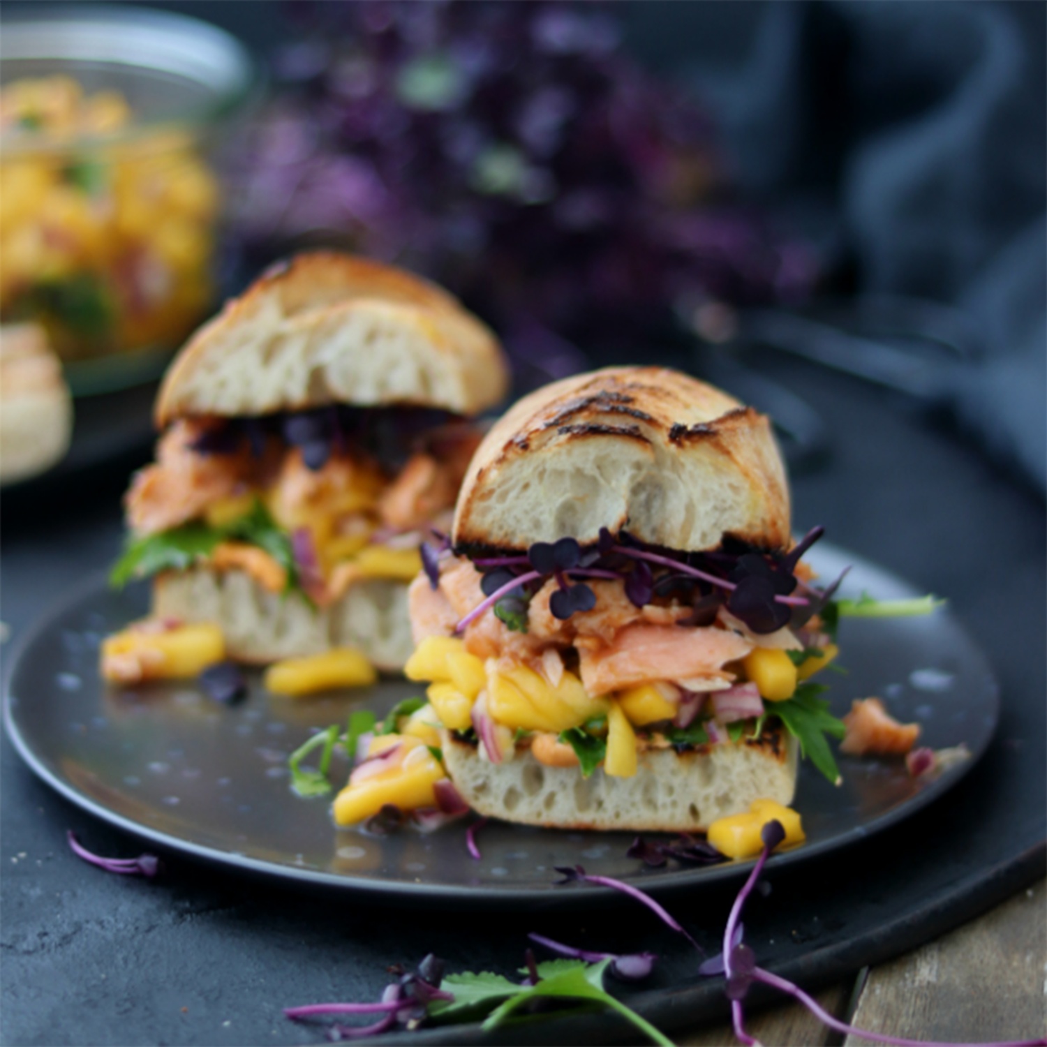 Das knusprige Ciabatta mit etwas Mayonnaise bestreichen und mit dem Pulled Lachs und der Mango Salsa belegen.