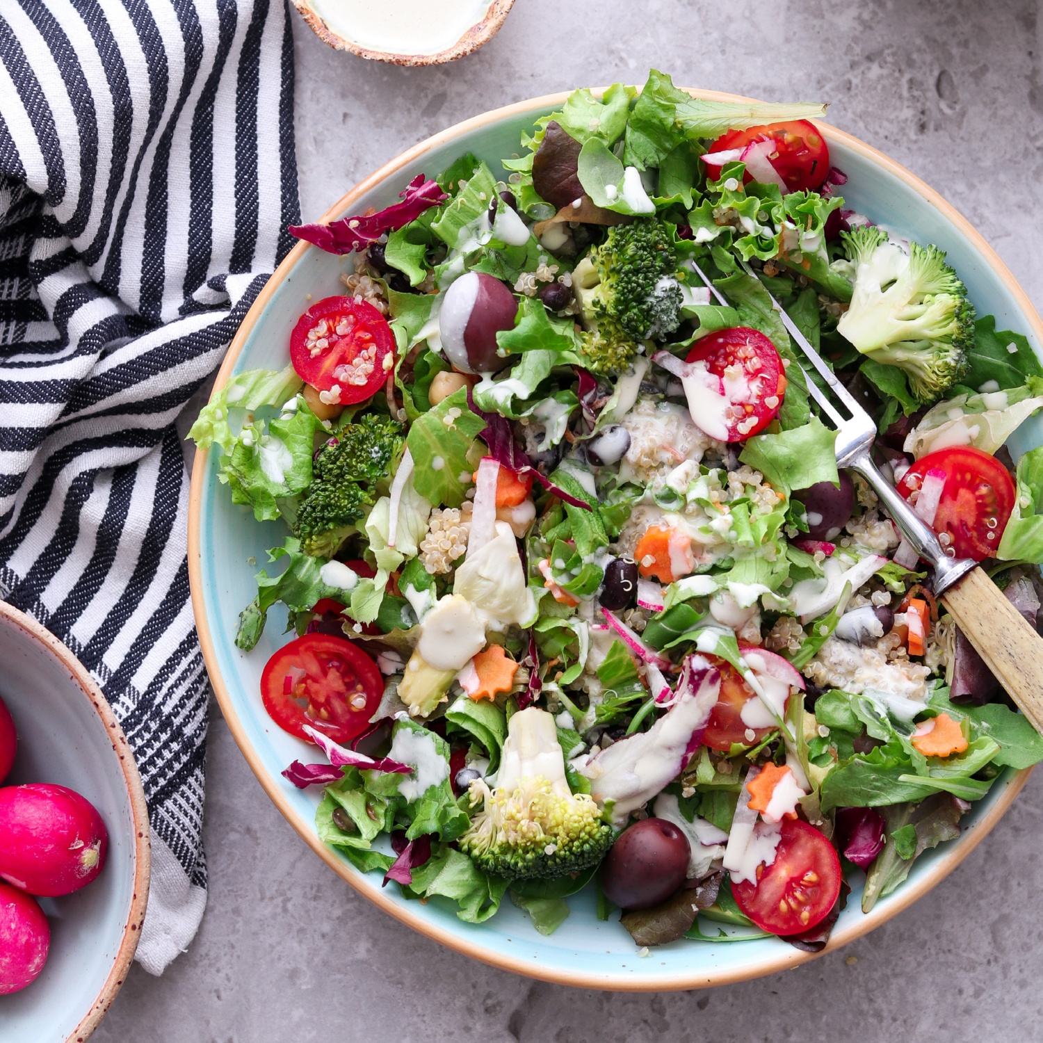 Quinoa auf Schüsseln aufteilen und mit Gemüse, Oliven und Kürbiskernen anrichten. Salat mit Dressing vermengen und servieren.