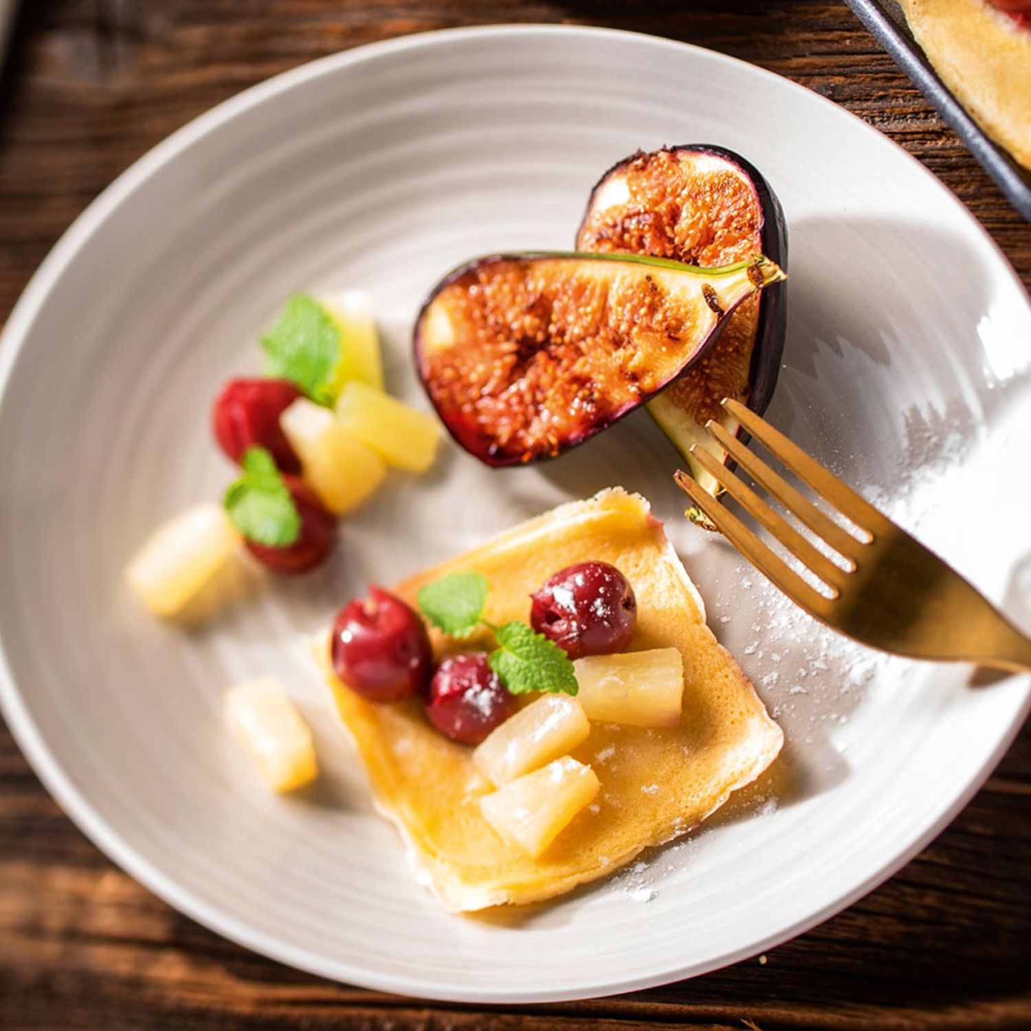 3. Ca. 3 – 4 Minuten im Raclette Grill backen. Die Palatschinke vorsichtig wenden und mit Weichseln und Ananasstücken belegen.
