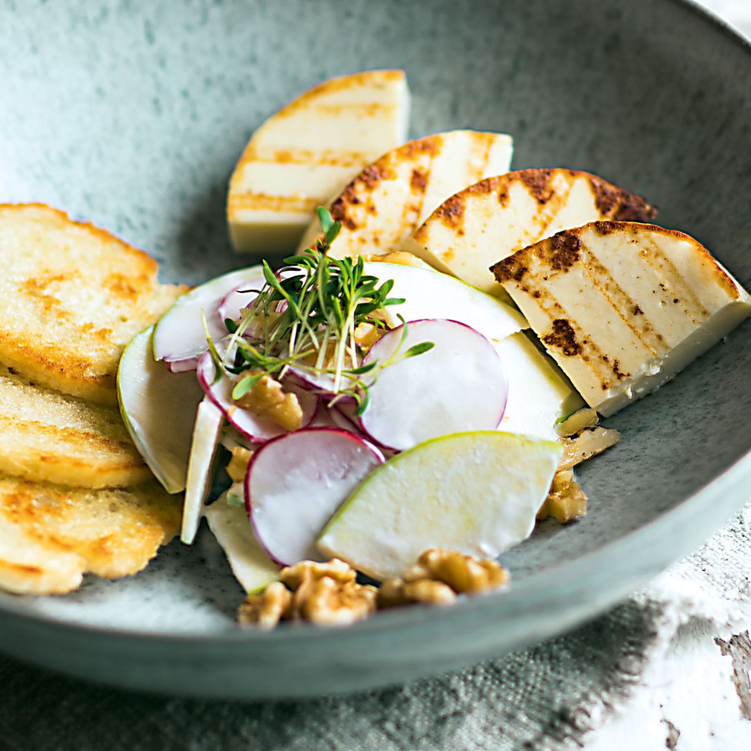 Baguette, Grillkäse und Radieschen-Apfelsalat auf Teller anrichten und mit Kresse und Walnusskernen bestreuen.