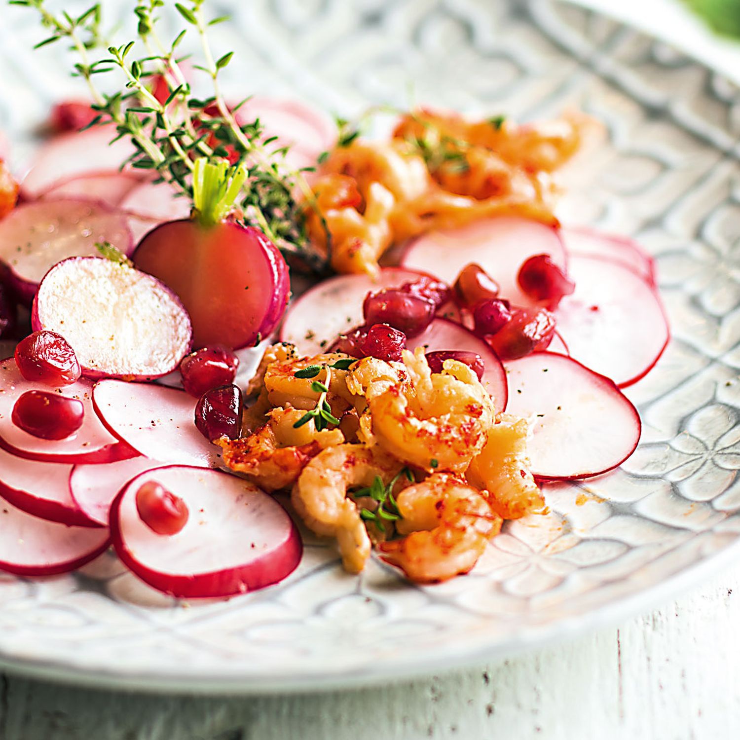 Nun die Flusskrebse und die restlichen Granatapfelkerne auf den Radieschen verteilen.