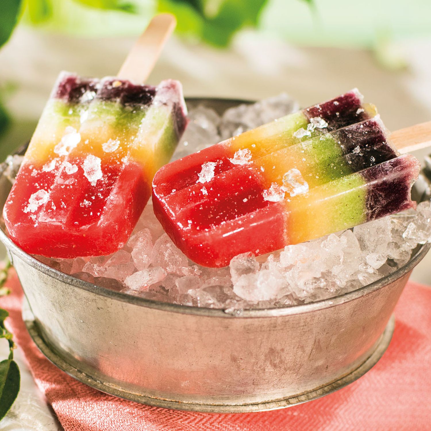 Zuerst die Erdbeermasse in die Stieleisformen füllen, anschließend Mango, Ananas, Kiwi und zuletzt die Heidelbeermasse. Zwischen jeder Schicht die Form für ca. 10 Minuten einfrieren, damit die Schichten nicht ineinander verlaufen.