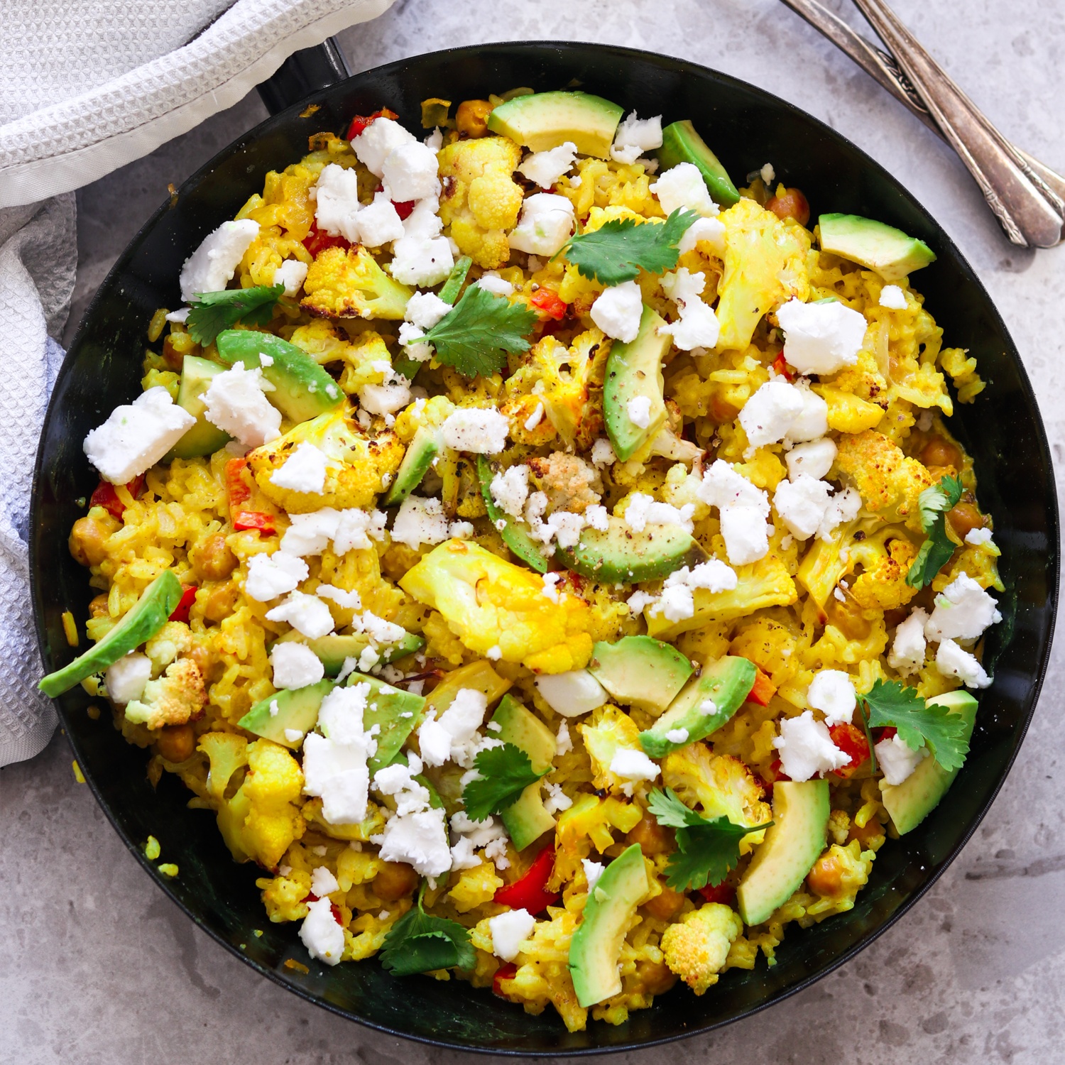 5. Den Reis in Schüsseln anrichten, den gerösteten Karfiol darauf verteilen und mit dem Dressing beträufeln. Mit etwas Avocado, Feta und frischem Koriander servieren.