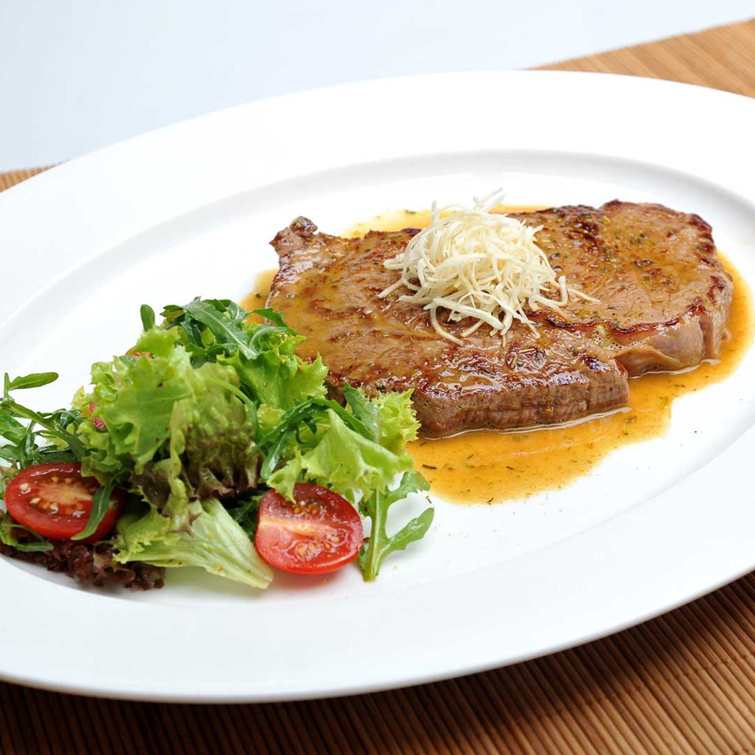 Die Steaks auf warme Teller legen, je etwas Kren mittig darauf setzen und den marinierten Blattsalat daneben anrichten.