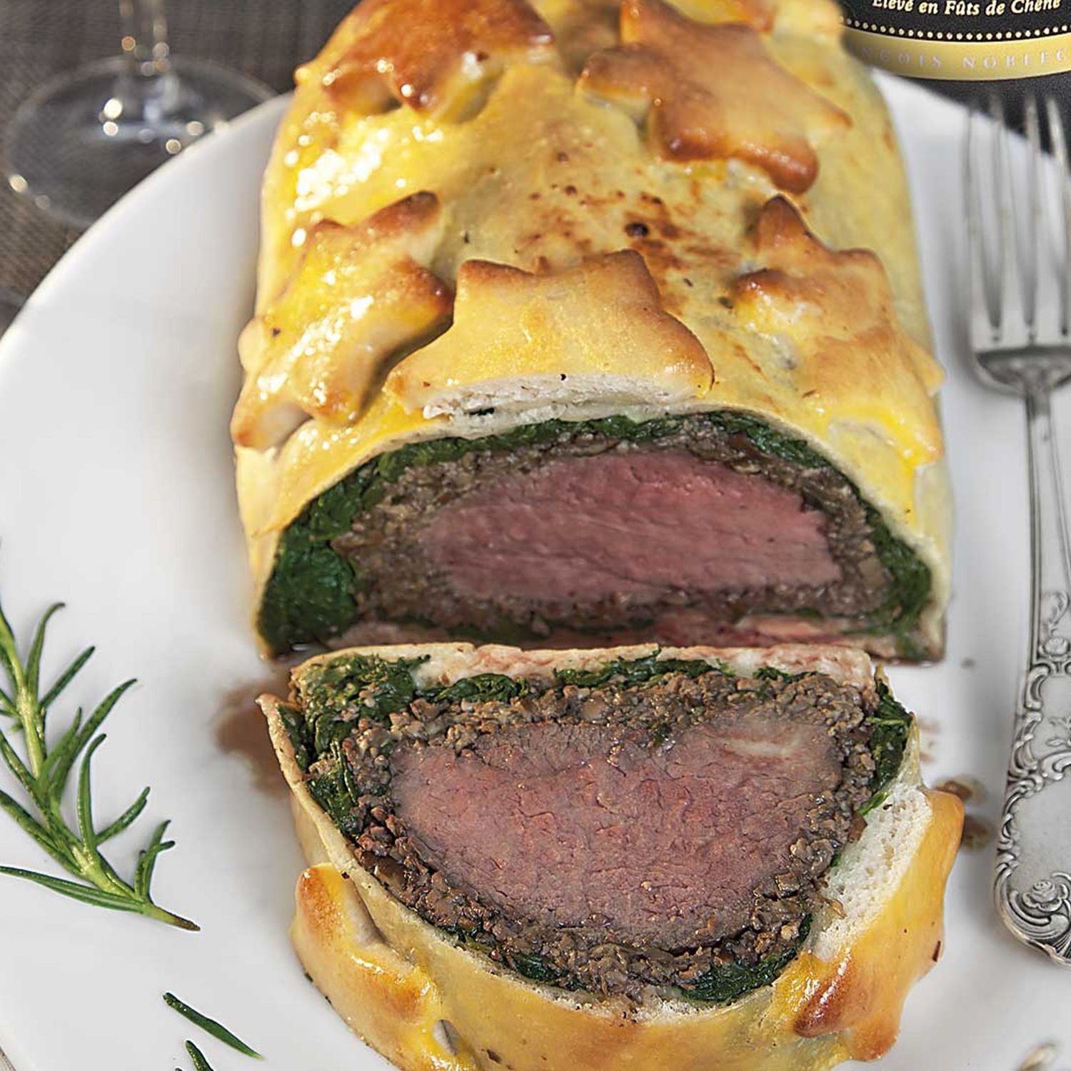 Die Pizzateige auf einer mit Mehl bestreuten Arbeitsfläche ausrollen und aus einem Teig einige kleine Sterne ausstechen. Backofen auf 160 °C Ober-/Unterhitze (140 °C Umluft) vorheizen. Den vorbereiteten Spinat ungefähr 1 cm dick auf den zweiten Teig legen und dabei einen Rand von etwa einem 1 cm frei lassen. Die Pilzfarce auf dem Spinat verteilen und darauf das Rinderfilet setzen. Die übrigen Eier trennen, die Dotter verquirlen, damit den Teigrand bepinseln und das Filet einrollen. Mit dem restlichen Eigelb die Teigrolle bestreichen und darauf die Teigsterne platzieren.