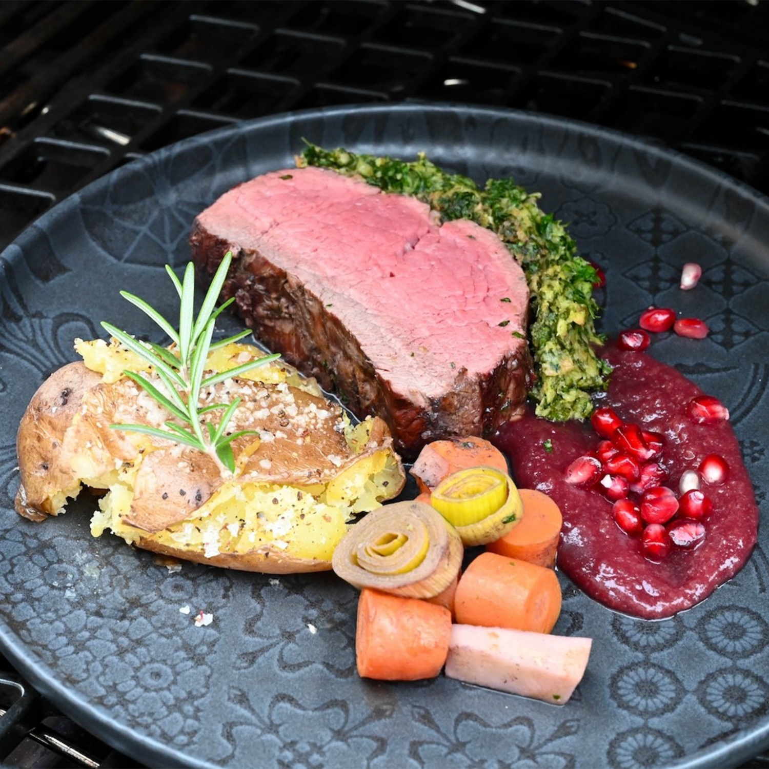 Ein zartrosa gegrilltes Rinderfilet mit einer würzigen Kräuter-Senfkruste, verfeinert mit fruchtiger Granatapfelsauce – ein gehobenes Gericht, das mit cremigen Smashed Potatoes perfekt abgerundet wird. Ideal für besondere Anlässe!