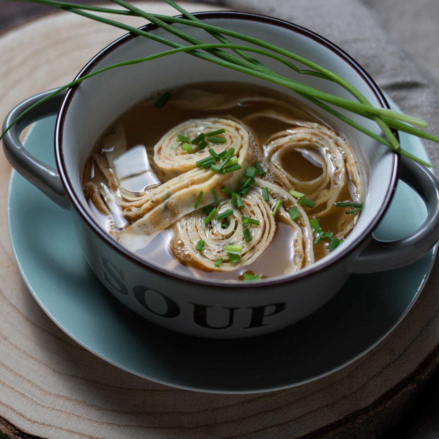 Zum Anrichten, Frittaten in den Suppenteller geben und mit heißer Rindsuppe aufgießen. Schnittlauch in Röllchen schneiden und die Suppe damit garnieren.