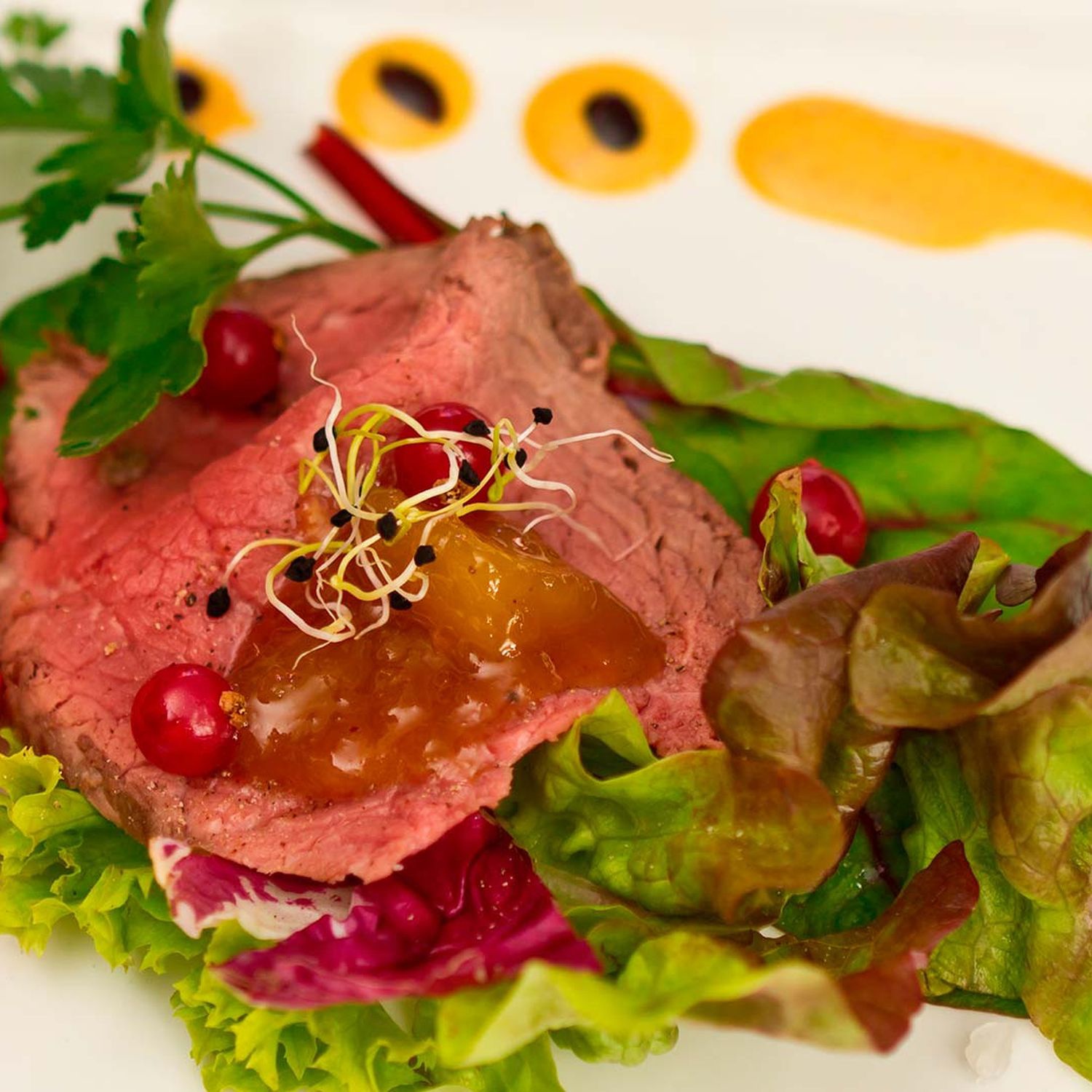 Rosa gebratenes Roastbeef mit Erdbeer-Salsa