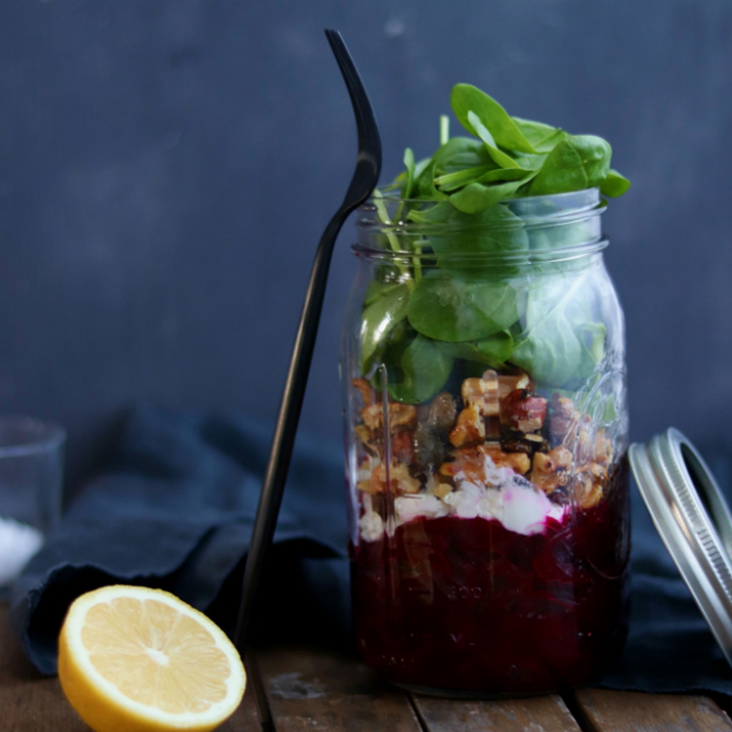 Deshalb zuerst den Rote-Rüben Salat in ein Glas oder eine Schüssel geben. Dann den Ziegenfrischkäse darauf verteilen. Im Anschluss folgt die knusprige Nuss-mischung und darauf der Blattspinat.