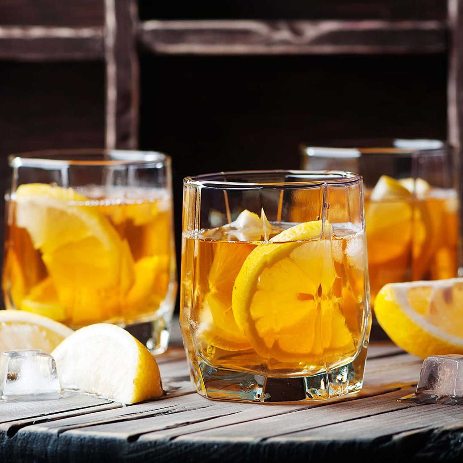 Zucker, Zitronensaft, Gin, Rum und Eiswürfel im Cocktail-Shaker gut schütteln. Eiswürfel in ein Glas füllen, Cocktail eingießen, mit Wasser Plus Frucht auffüllen und mit einer Zitronenscheibe servieren.