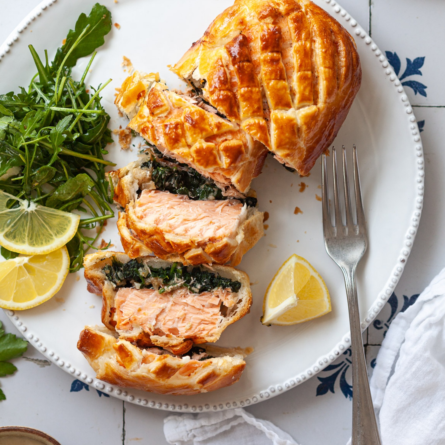 Den Blätterteig ausrollen und das Lachsfilet in der Mitte platzieren. Den Lachs mit der Spinat-Mischung bedecken. Den Blätterteig über dem Fisch schließen und mit verquirltem Ei bestreichen. Für ca. 30 Minuten im Ofen goldbraun backen.